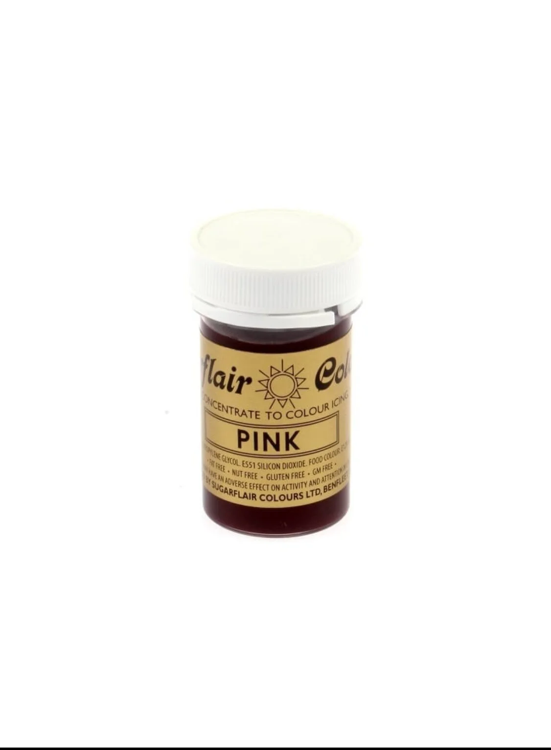 Highly concentrated paste food colouring. All Sugarflair colours are fat free, nut free, gluten free, GM Free and suitable for vegetarians and vegans. Add to buttercream, royal icing, fondant, creams and cake mixes.